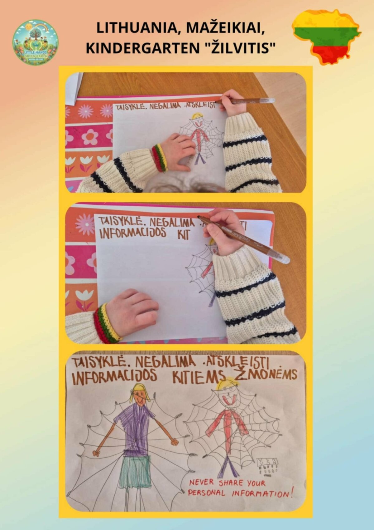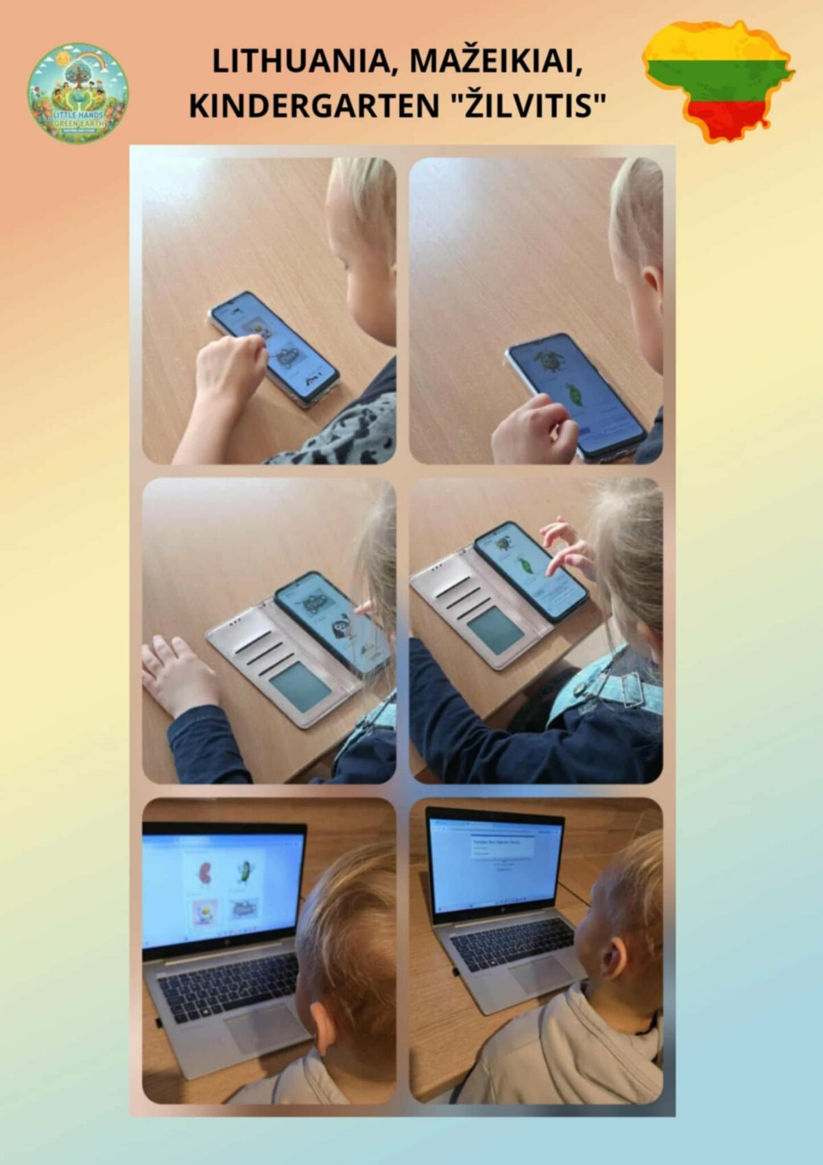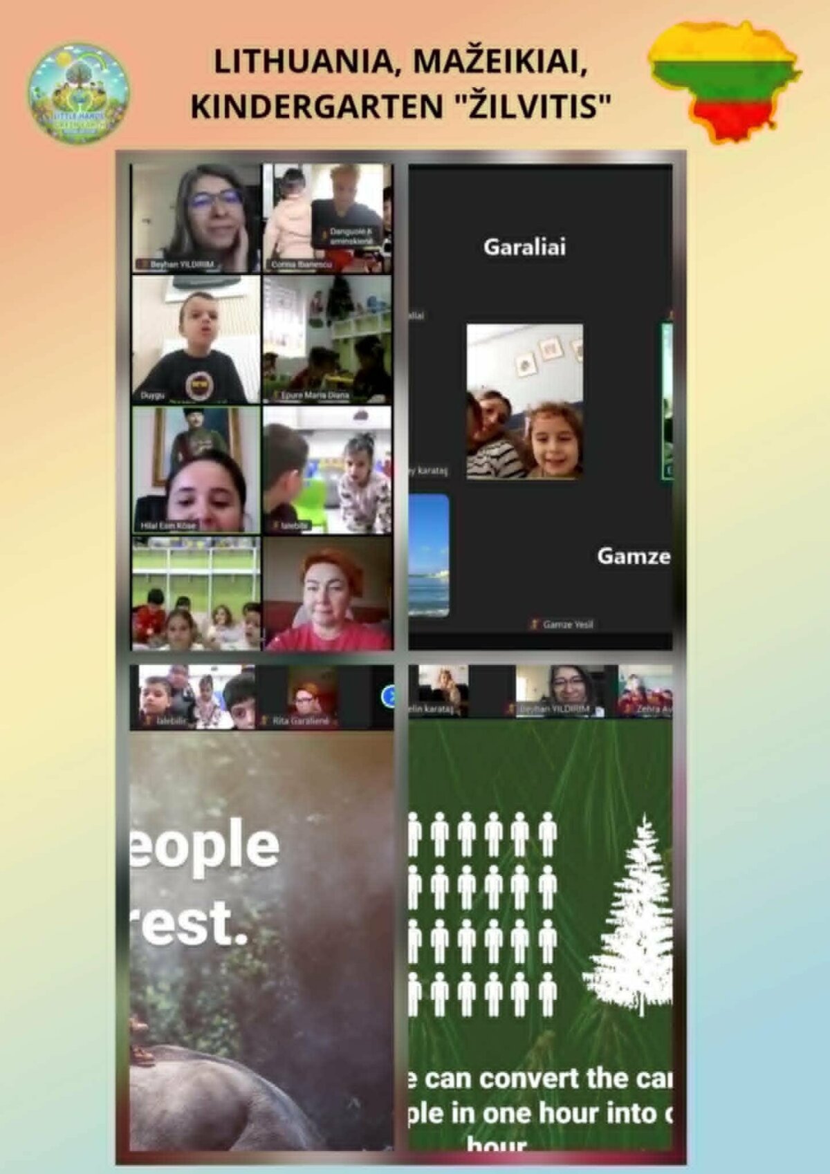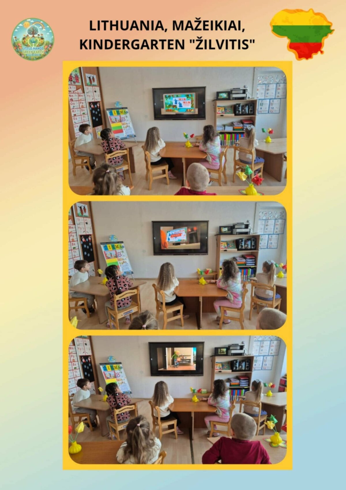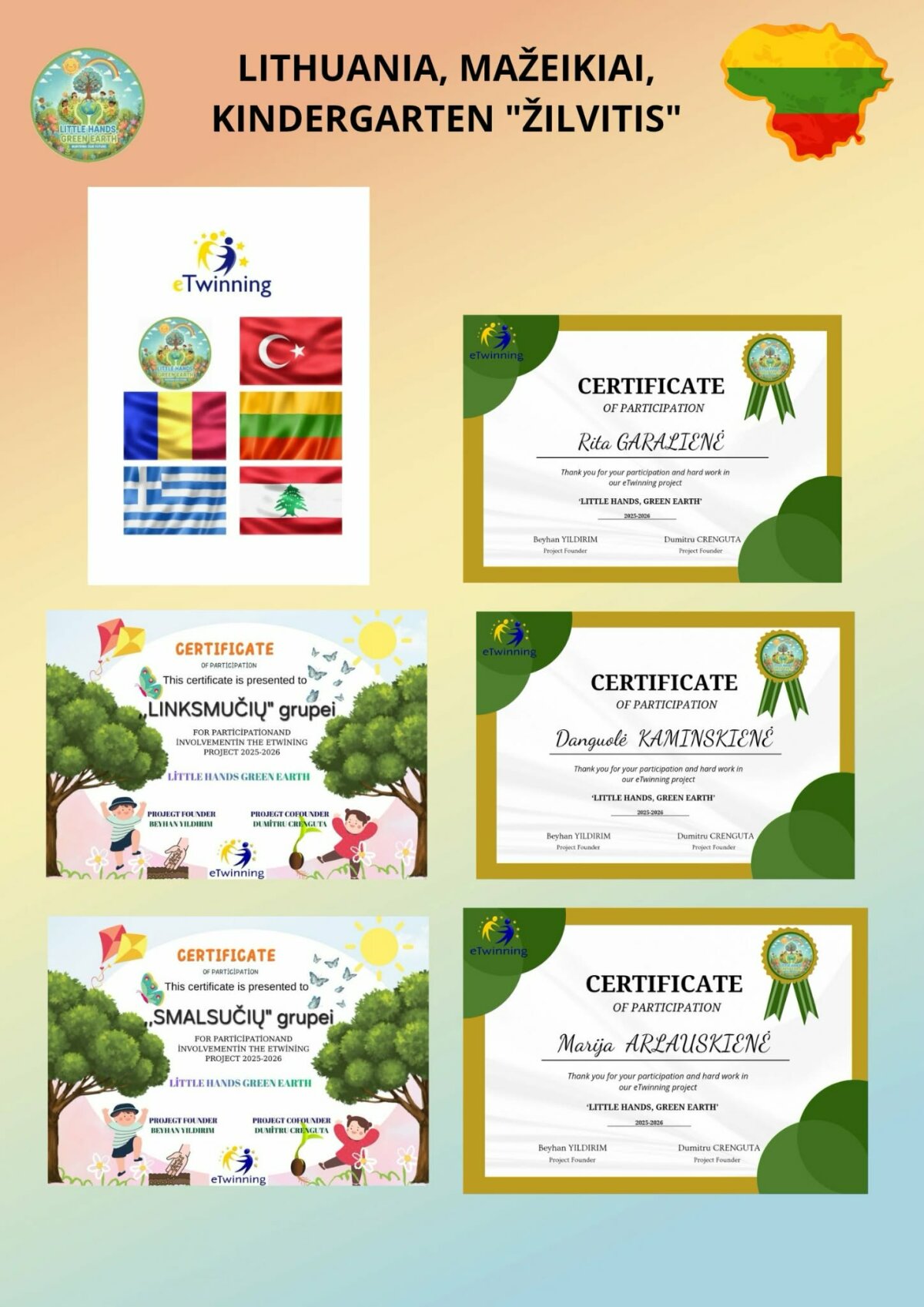 Mažeikių lopšelio-darželio „Žilvitis“ priešmokyklinių grupių vaikai dalyvavo tarptautiniame „eTwinning“ projekte „Mažos rankytės, žalia žemė“ („Little Hands, Green Earth“), kurį inicijavo mokytoja Beyhan YILDIRIM iš Turkijos. Šiame projekte dalyvavo ugdymo įstaigos iš Turkijos, Rumunijos, Graikijos, Lietuvos ir Libano. Projekto metu vaikai ugdė meilę gamtai, stiprino aplinkosauginį sąmoningumą, lavino STEM veiklų įgūdžius ir kritinį mąstymą, atliko eksperimentus. Jie mokėsi praktiškai rūpintis aplinka: gamino sėklų kamuoliukus, sodino medelius, susipažino su klimato kaitos problemomis, atsinaujinančiais energijos šaltiniais bei gamtos išsaugojimo būdais. Vaikai ir mokytojai taip pat aktyviai dalyvavo nuotoliniuose susitikimuose su projekto partneriais, kurių metu dalijosi patirtimi, pristatė savo veiklas. Projekto eigoje buvo vykdomos anketinės apklausos, padėjusios įvertinti dalyvių įgytas žinias, patirtis bei projekto naudą. Projektas ne tik praturtino vaikų žinias, bet ir skatino atsakingą požiūrį į gamtą bei tvarių įpročių formavimą kasdieniame gyvenime.